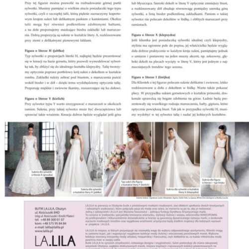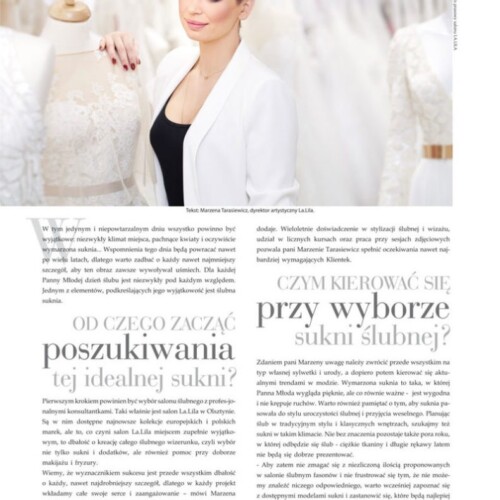 Salon LA.LILA regularnie pojawia się w ogólnopolskich publikacjach branżowych i lifestyle’owych, dzieląc się wiedzą, doświadczeniem oraz miłością do mody ślubnej. Nasze stylizacje i eksperckie wypowiedzi można było zobaczyć m.in. w magazynie Make Up Trendy, w artykułach takich jak „Boho Chic – trend sezonu ślubnego 2018” oraz „Suknie ślubne”, gdzie prezentowaliśmy najnowsze kierunki w modzie i sposoby dopasowania sukni do indywidualnego stylu Panny Młodej.