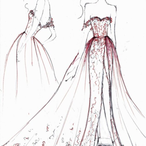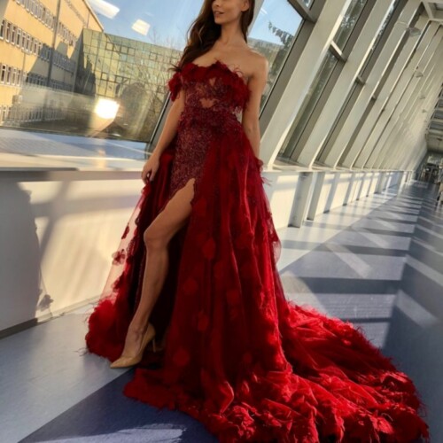 Inspiracją projektu była sama Agata – kobieta o silnym charakterze i ognistym temperamencie. Dlatego powstała spektakularna, rubinowoczerwona suknia z długim trenem i trójwymiarowymi aplikacjami, wykonana z wyjątkowej hiszpańskiej koronki.