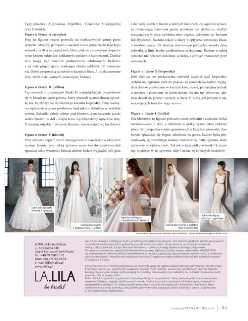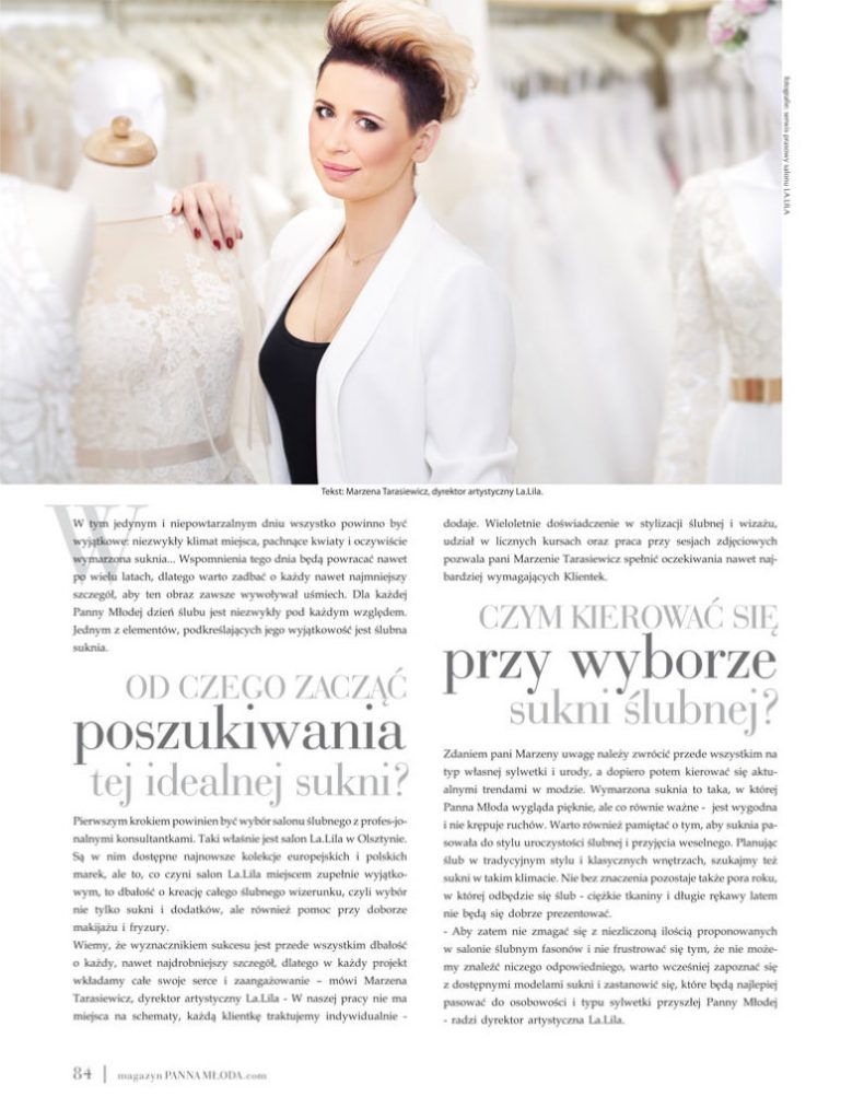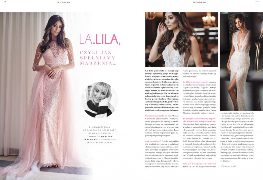 Salon LA.LILA regularnie pojawia się w ogólnopolskich publikacjach branżowych i lifestyle’owych, dzieląc się wiedzą, doświadczeniem oraz miłością do mody ślubnej. Nasze stylizacje i eksperckie wypowiedzi można było zobaczyć m.in. w magazynie Make Up Trendy, w artykułach takich jak „Boho Chic – trend sezonu ślubnego 2018” oraz „Suknie ślubne”, gdzie prezentowaliśmy najnowsze kierunki w modzie i sposoby dopasowania sukni do indywidualnego stylu Panny Młodej.