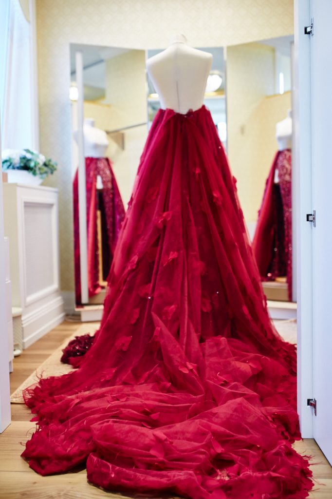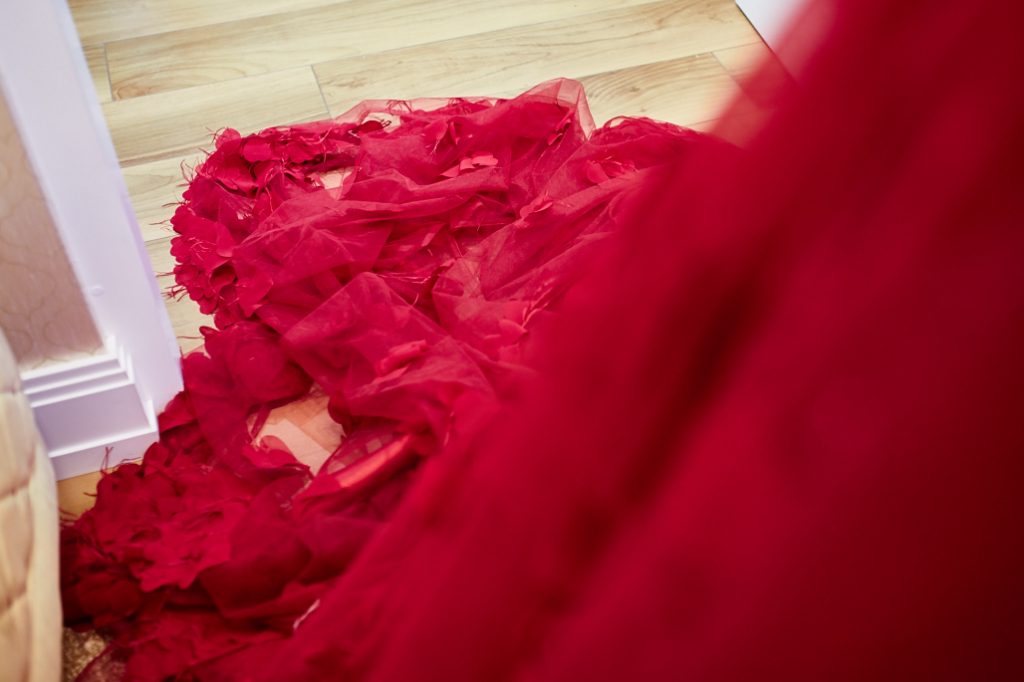 Inspiracją projektu była sama Agata – kobieta o silnym charakterze i ognistym temperamencie. Dlatego powstała spektakularna, rubinowoczerwona suknia z długim trenem i trójwymiarowymi aplikacjami, wykonana z wyjątkowej hiszpańskiej koronki.